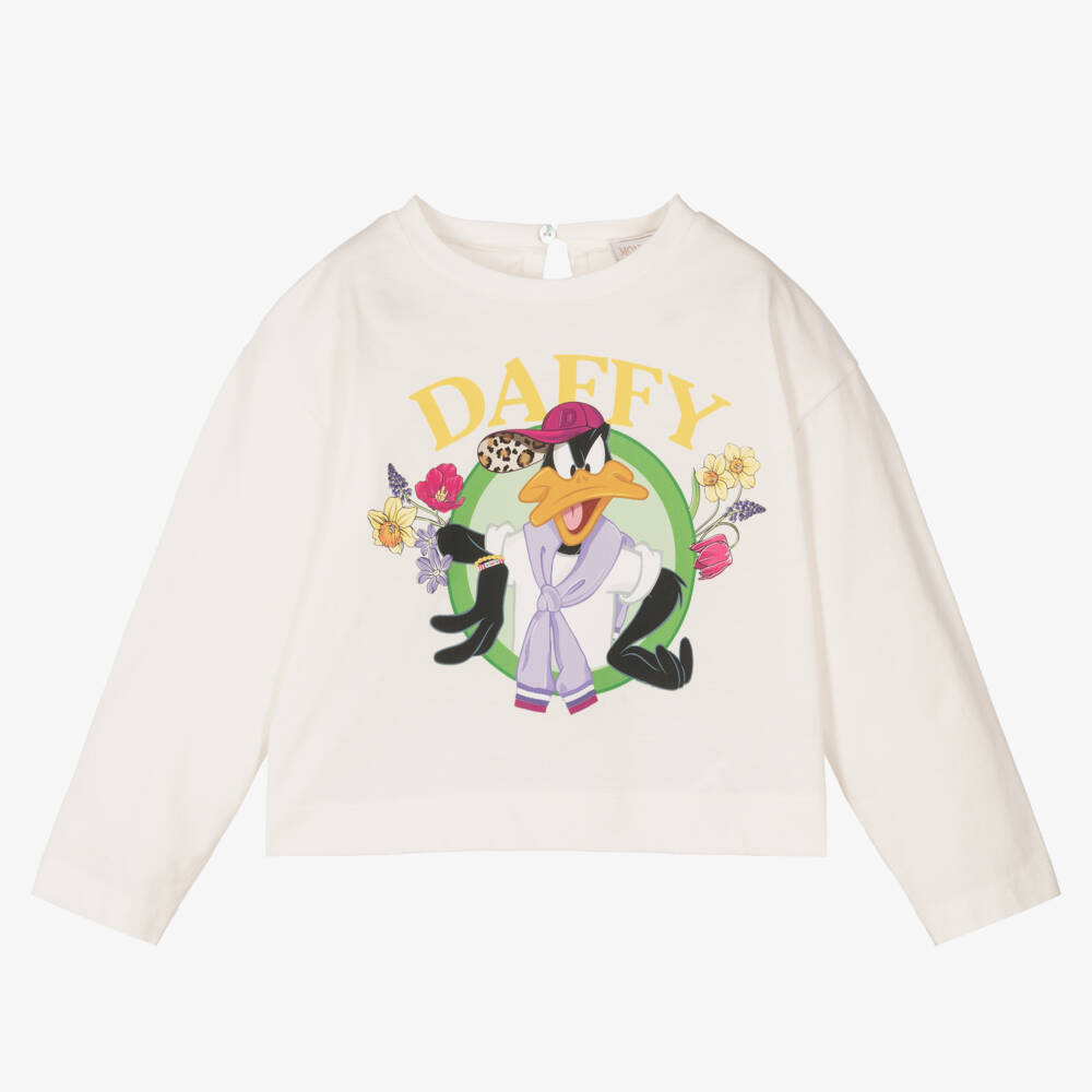 Versatile ivory top for girls by Italian designer Monnalisa. Casual and comfortable, it is made in a soft and stretchy cotton jersey. Drawing inspiration from Looney Tunes, it has a Daffy Duck character print on the front with floral motifs for a sweet, feminine touch. It fastens with a single pearlescent button on the back.