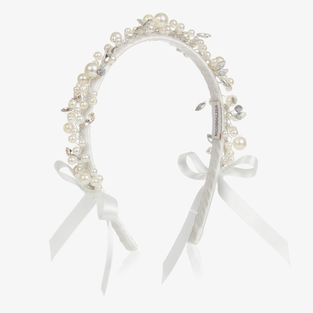 An elegant ivory hairband for girls by Italian brand Monnalisa. The narrow flexible band is covered in satin ribbon and beautifully decorated with faux pearls, clear crystals and ribbon bows.