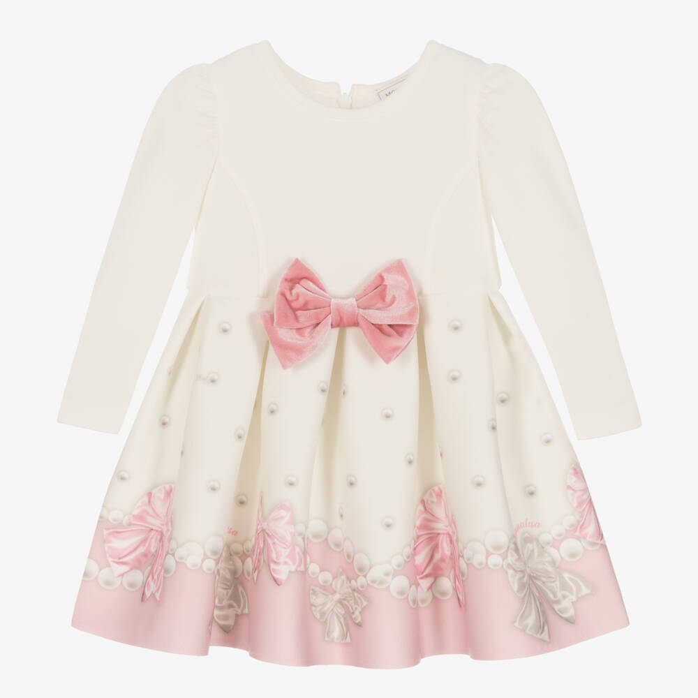 Lovely ivory dress for little girls by Italian designer Monnalisa. This gorgeous dress has an ivory ribbed jersey bodice with sweet puffed sleeves. The full skirt is made in a smooth, double-knit jersey and is beautifully patterned with a stunning pink bow and pearl print. For a sweet finish, there is a pink velvet bow on the waistline. It is fully lined for comfort and fastens easily on the back with a neatly concealed zip.