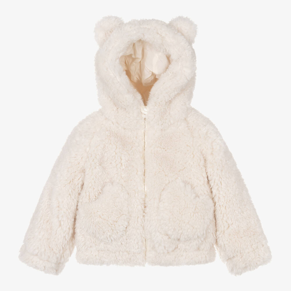 This adorable ivory jacket for little girls is designed by Italian brand Monnalisa. So soft and fluffy, it is made in cosy sherpa fleece, with teddy bear ears on the hood for a sweet look. It has front patch pockets for warming tiny hands, a softly woven viscose lining, and a front zip with a satin guard at the top to protect her chin.