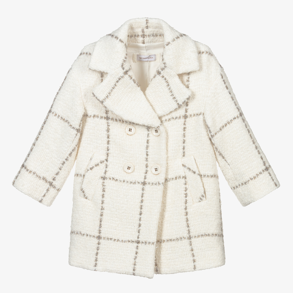 Ivory coat for girls by Monnalisa, made in a blend of soft wool and acrylic, with a glittery gold and silver check pattern. In a double breasted style, it has a silky lining, slanted front pockets and logo button fastenings.
