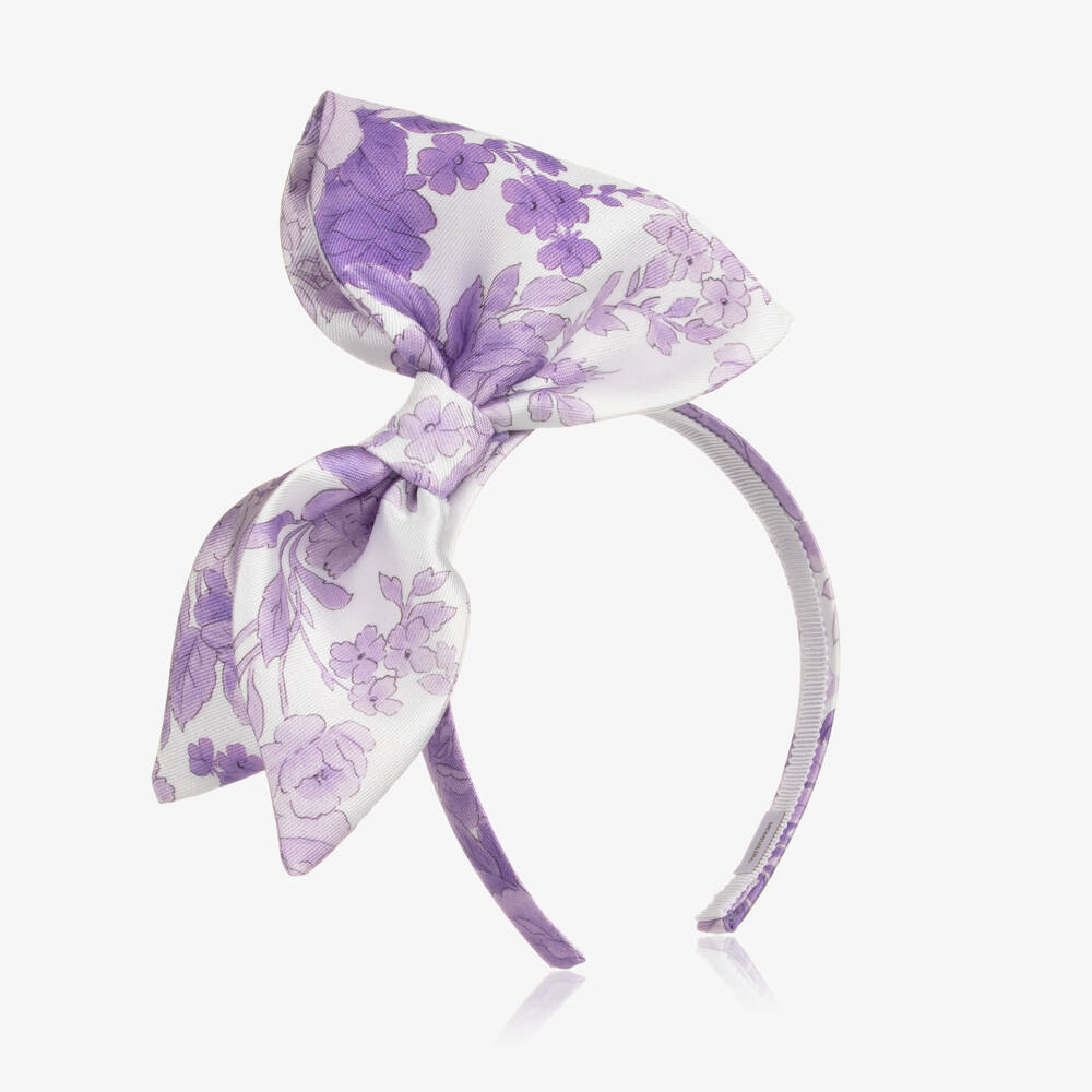 A lovely finishing touch to a special outfit, this white and lilac purple hairband for girls is from Italian designer, Monnalisa Chic. It features a large asymmetric satin twill bow with a beautiful floral pattern, sitting on a matching satin-covered, flexible band.