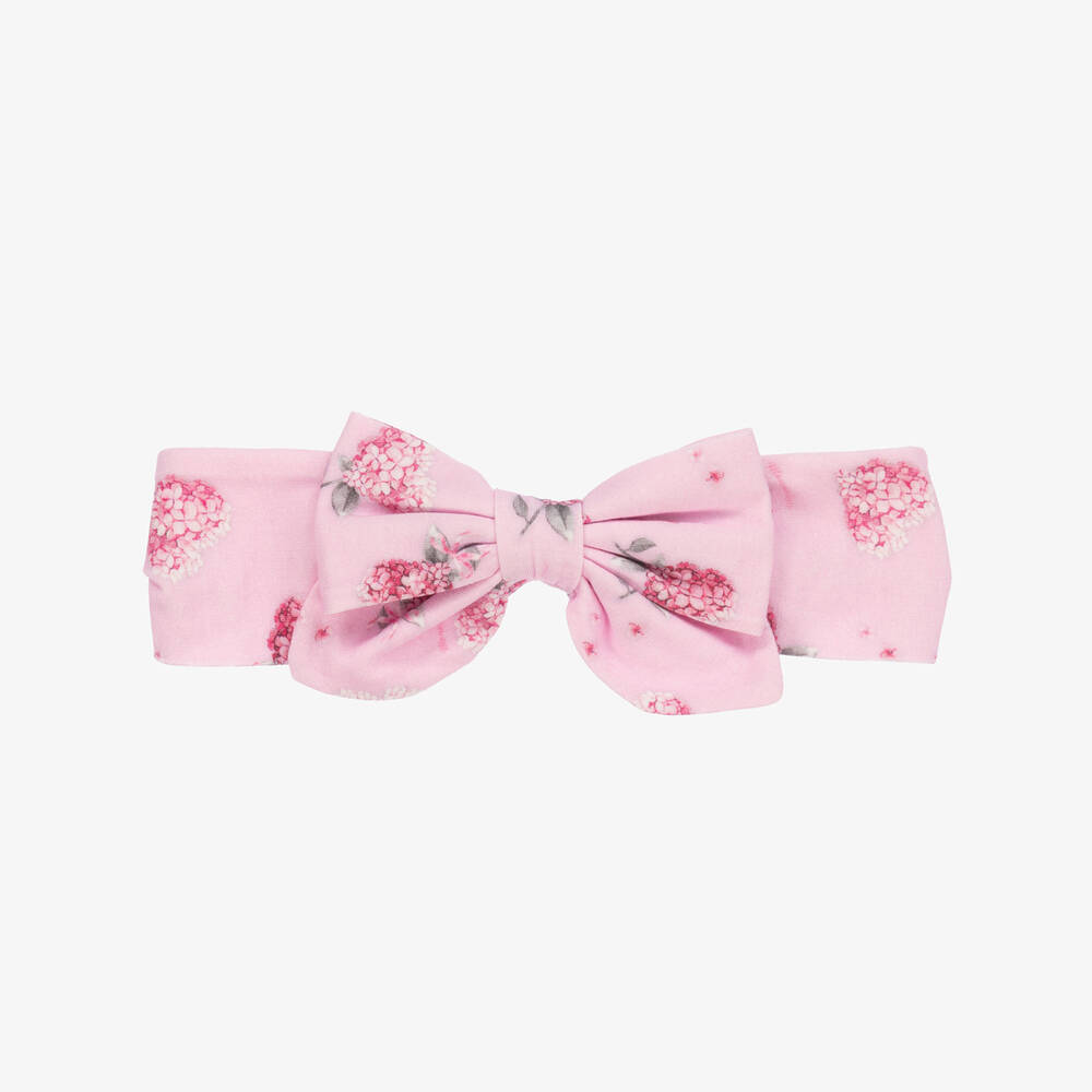 A pretty pink headband for little girls by Monnalisa, made from soft cotton jersey. Printed with a charming floral pattern, it has a statement bow decoration for a sweet look. There is an elasticated panel at the back to ensure a comfortable fit.