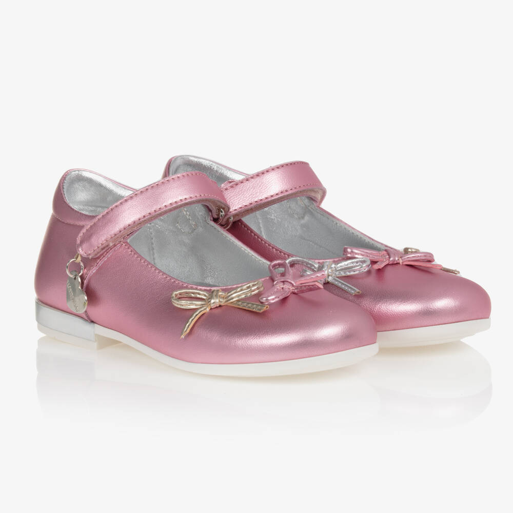 A stunning pair of pink leather ballet pumps for girls, by Monnalisa. In a shiny metallic design, these shoes are topped with pretty gold and silver bows. The T-bar straps fasten neatly with velcro, and have a heart-shaped charm logo attached. They have a breathable leather insole with light contouring, and a non-slip rubber outsole for supportive wear.