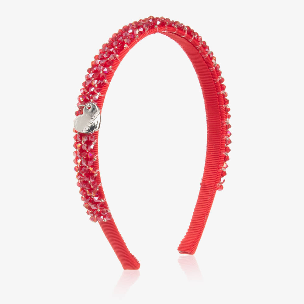 Girls red sparkly crystal hairband by Monnalisa. This luxury hair accessory by the Italian brand provides a beautiful finishing touch to an outfit. The slim band is encrusted with a double row of floral-shaped crystals that reflect the light. A silver logo heart charm is stitched at the side and it is lined in grosgrain ribbon.