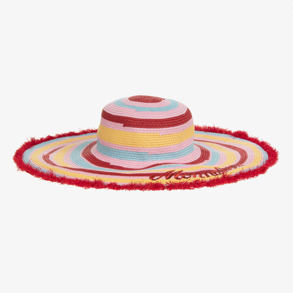 Lovely for the summer, a statement straw hat for girls by Italian brand Monnalisa. Designed in colourful stripes, it has a wide, floppy brim embroidered in red with the designer's name for a branded touch. Offering protection from the sun, It has a red frayed trim for a chic finish.