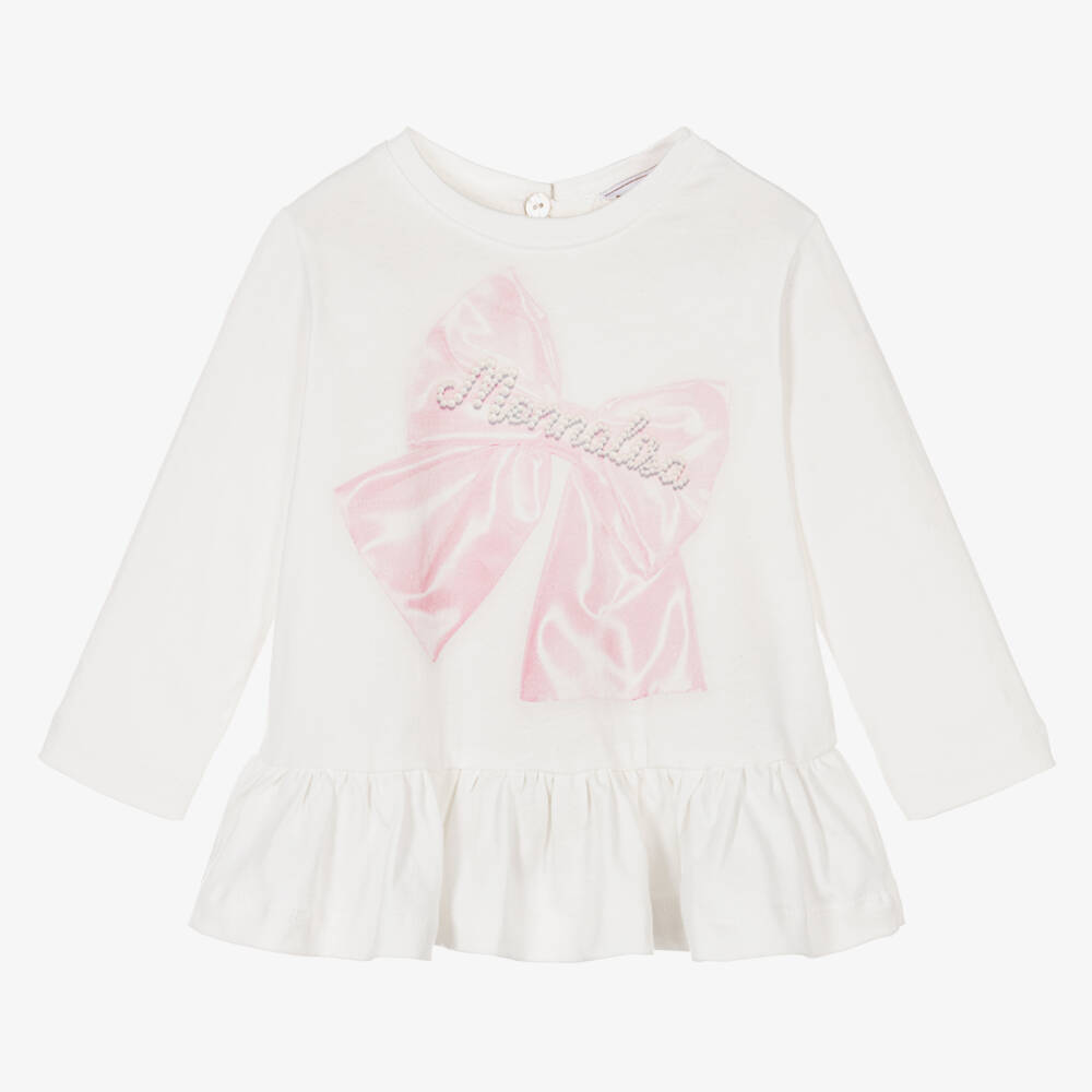 Off-white tunic top for little girls by Monnalisa, made from soft and stretchy cotton jersey. Making a statement, it has a pretty pink bow printed on the front incorporating the designer's name. It has a lightly ribbed neckline, a cute ruffled hem, and a keyhole button fastening on the back.