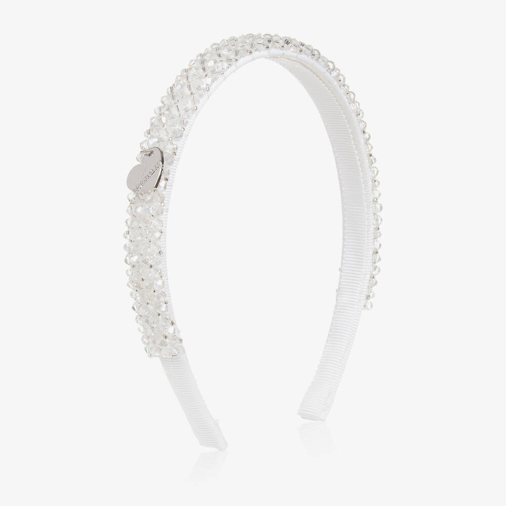 Girls white sparkly crystal hairband by Monnalisa. This luxury hair accessory by the Italian brand provides a beautiful finishing touch to an outfit. The slim band is encrusted with a double row of floral-shaped crystals that reflect the light. A silver logo heart charm is stitched at the side and it is lined in grosgrain ribbon.