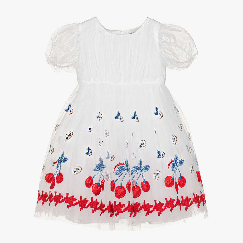 A gorgeous white tulle dress for girls by Monnalisa, embroidered with bold red and blue cherries on the skirt. Gently gathered at the waist, this eye-catching dress has sheer tulle sleeves with elasticated cuffs, and a neat zip fastening on the back. Lined for volume and flair, the embroidered skirt also features intricate white, brown and blue flowers and a deep red geometric pattern around the hem.