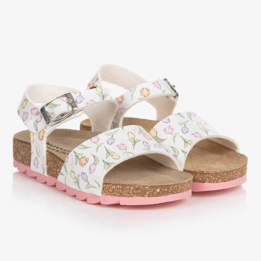 From Monnalisa, white faux leather sandals for girls. The straps are patterned with a pastel tulip floral print and they have a deep-treaded pink non-slip rubber sole for an alternative finish. The moulded leather inner sole creates comfortable support and the buckle fastening strap around the ankle secures the foot in place whilst being adjustable for a great fit.