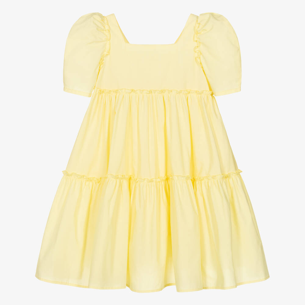 A charming yellow dress for girls by Monnalisa, in a pretty tiered design with elegant puffed sleeves. Made in smooth cotton poplin, it has a lightweight lining and is trimmed with a heart logo charm at the back. In a comfortable relaxed fit, this charming dress simply slips on over the head.