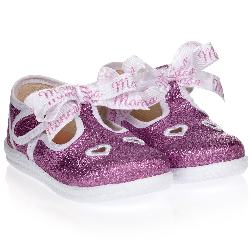 Younger girls lovely and sparkly pink glitter T-bar shoes by Monnalisa. They have white trims, embroidered heart shaped cut-outs with glittery pink and white branded bows. Lined in soft cotton canvas with soft leather insole, they have a flexible white rubber sole and velcro fastening on the ankle straps.
