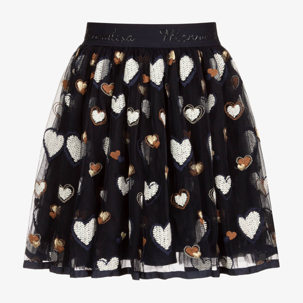 Navy blue tulle skirt for teen girls by Monnalisa, with beautifully embroidered wool-blend hearts in ivory, navy blue, brown and gold. There is a navy blue grosgrain trim on the hem and a branded elasticated waist for easy pull-on. Layers of soft tulle create volume and it has a lightweight viscose blend lining.