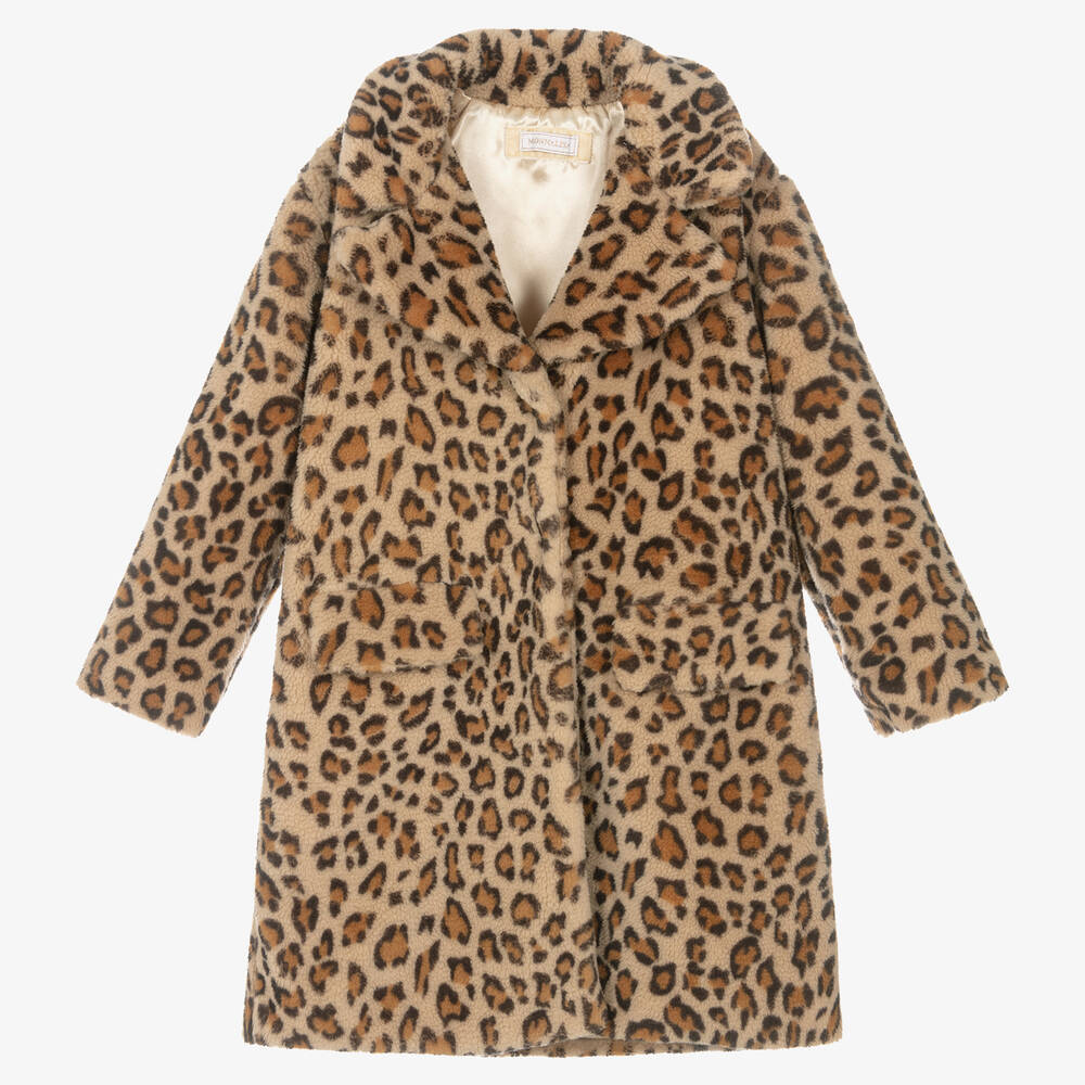 Leopard print beige coat for teen girls from Monnalisa. Timelessly stylish, it is made in soft teddy fleece and lined with glamorous gold satin. The useful popper fastening and front pockets are concealed to not distract from this chic coat.