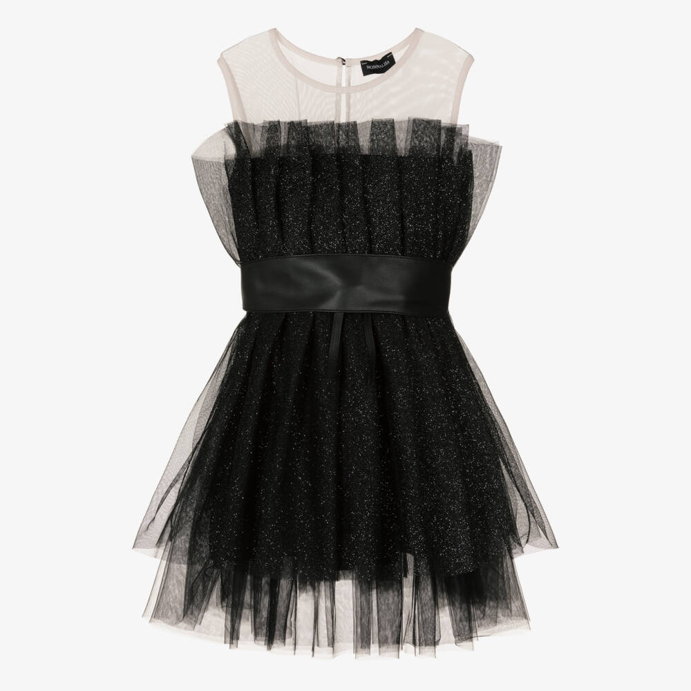 Black tulle dress for teen girls by Monnalisa, with an eye-catching silver glitter finish. Great for parties, this statement piece has a pale pink, sheer mesh bodice with a gathered, ruffle trim and a concealed zip fastening on the back. Fully lined, the pleated skirt is made with layers of tulle and has a faux leather belt around the waist for a feminine silhouette.