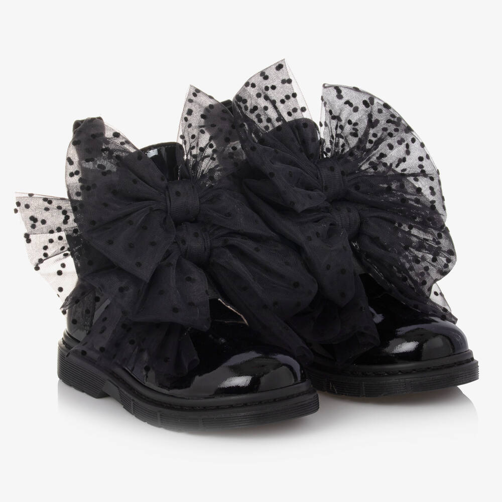 Stylish black patent leather ankle boots for teen girls by Italian label Monnalisa. Luxuriously soft and shiny, they have tonal black dotted tulle bows for a glamorous statement look concealing the elasticated straps. The silver tone heart-shaped logo plate on the heel pull adds a subtle branded touch. They have comfortable, soft leather lining in contrasting silver and chunky rubber outsole for improved grip. There is a zip and a little velcro tab to fasten on the side.
