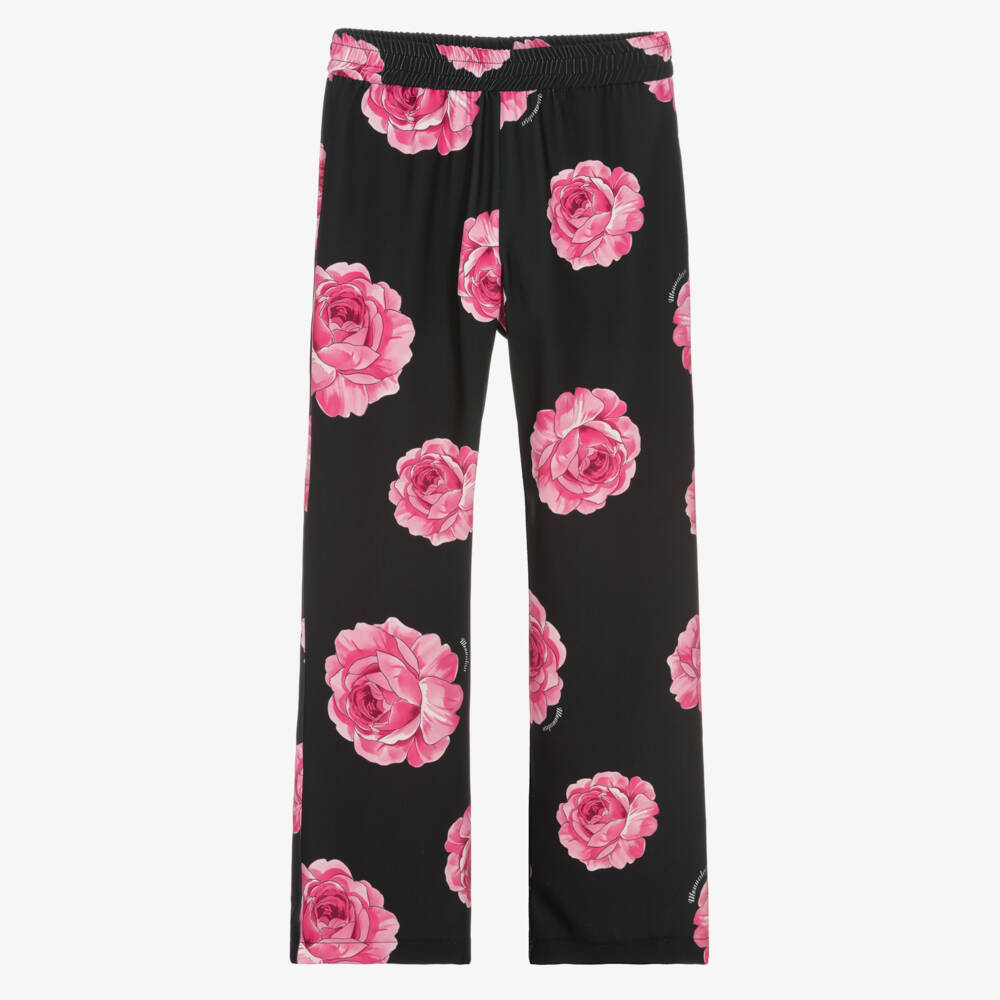 A sophisticated pair of black crêpe trousers for teen girls, from Monnalisa Chic. These trousers are patterned in a graphic pink rose design, with the brand's signature logo discreetly signed throughout. Designed in a wide leg fit, these smart-casual trousers are comfortably finished with an elasticated waist and side seam pockets.