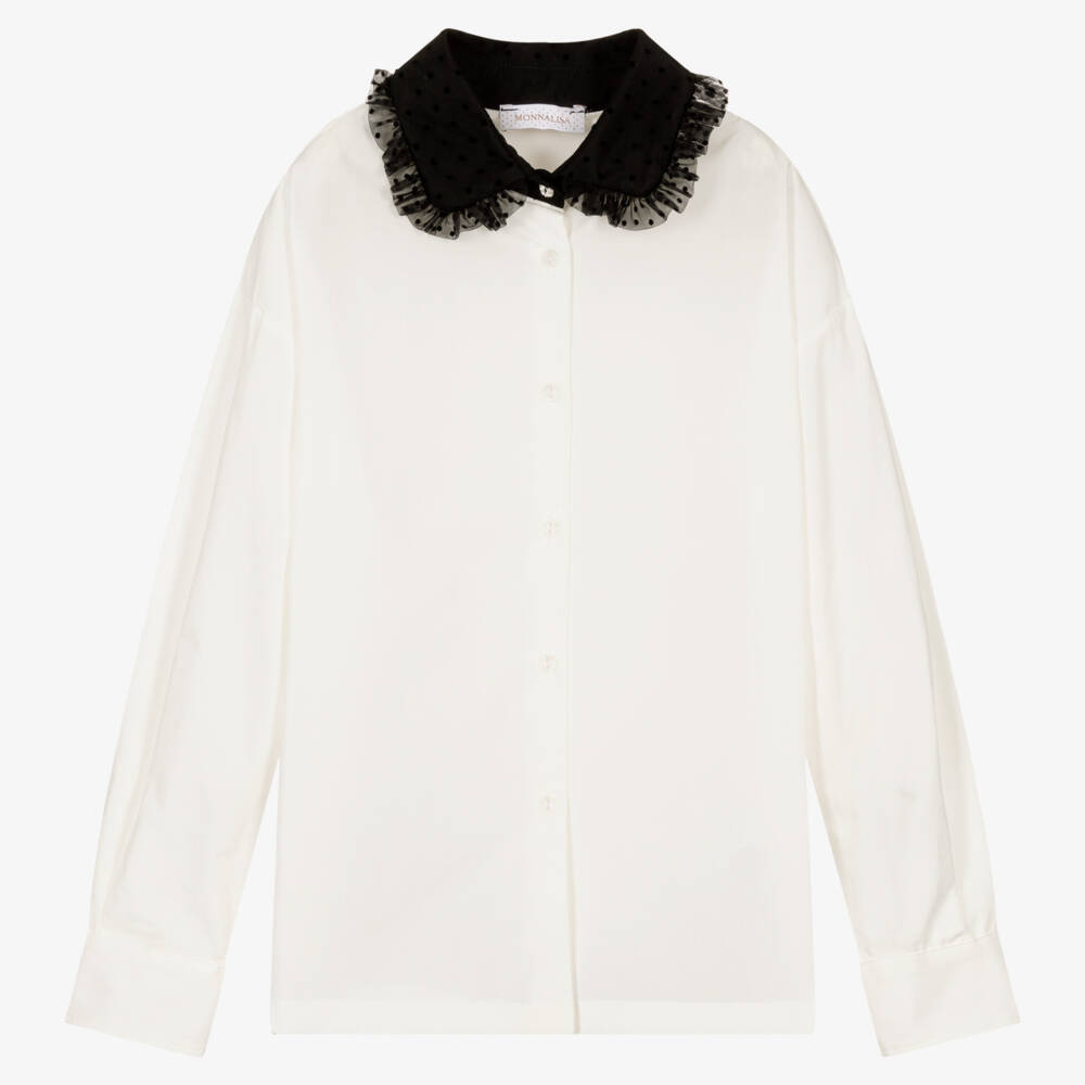 Stylishly smart, an ivory cotton poplin blouse for teen girls, from Monnalisa. Standing out from the blouse is a striking black tulle collar, which is beautifully ruffled with a flocked polka dot design. A sparkly button fastens at the top, with pearlescent logo-embossed buttons securing beneath for a subtle branded finish.