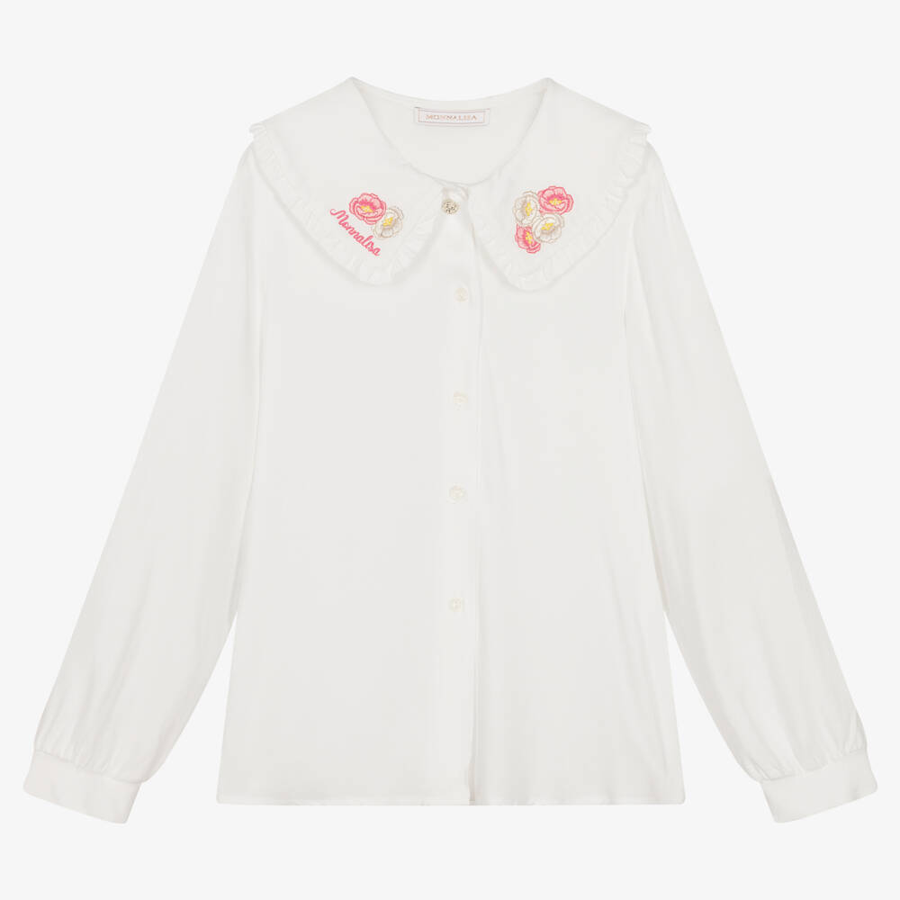 Stylish ivory blouse for teen girls by Italian brand Monnalisa. Beautifully feminine, the oversized frilled collar is decorated with floral appliqués and has the designer's name embroidered in pink, for a pretty designer finish. Made in super soft viscose twill, this lightweight blouse has elasticated cuffs and fastens with branded buttons on the front.