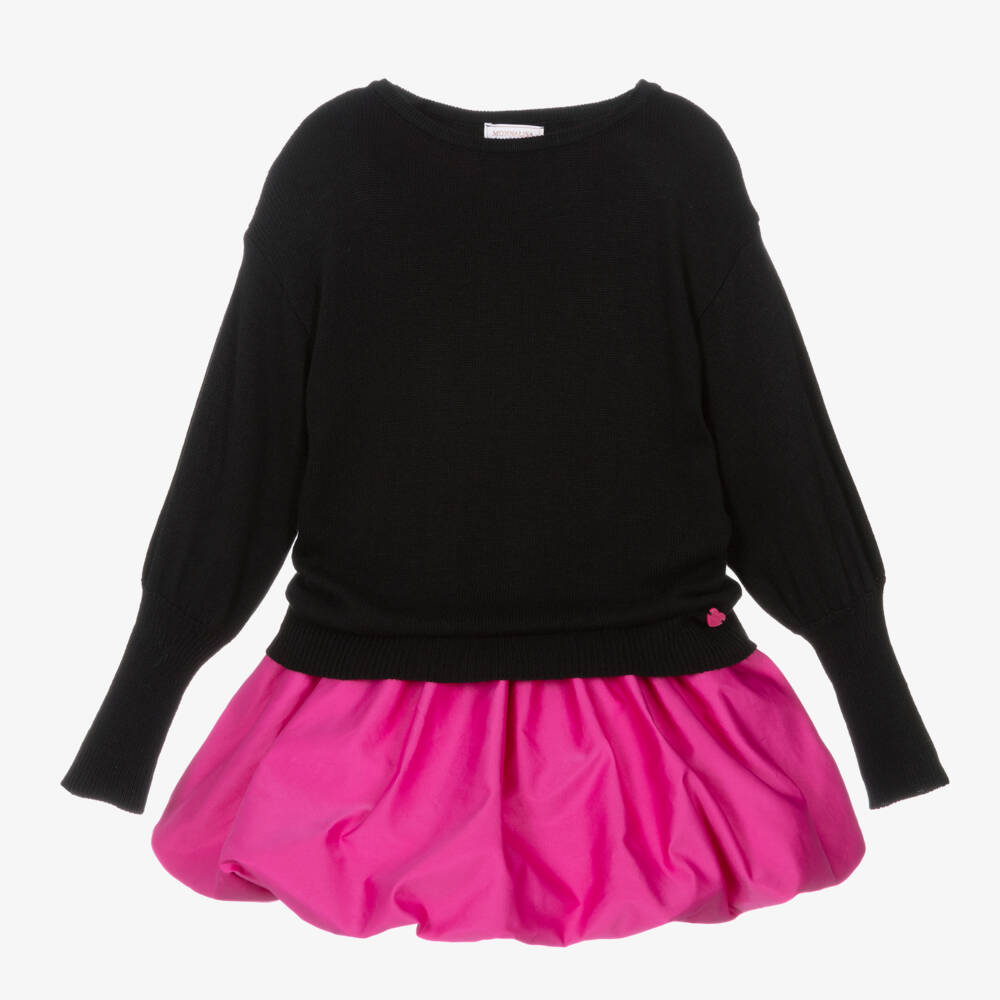 Dress set by Monnalisa, ideal for teen girls looking for a laid-back party look. The sleeveless fuchsia pink dress has a soft cotton jersey, drop-waisted bodice and a full, puffball-style taffeta skirt. It comes with a black sweater, knitted in a soft viscose and angora blend with a small, logo-embossed heart charm sewn by the ribbed hemline. It has casual, dropped shoulders with balloon sleeves and deep, ribbed cuffs for a touch of elegance. Easy to wear, both pieces just pull on.