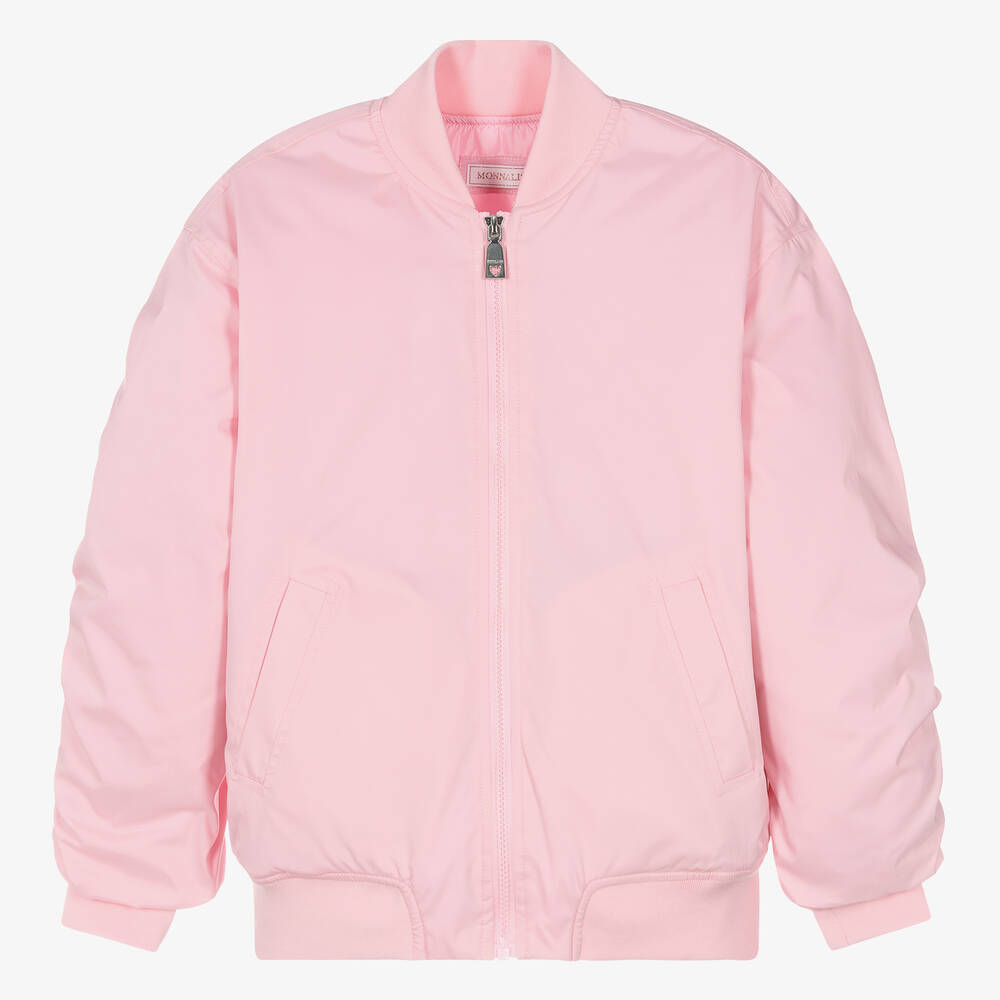 Teen girls bright pink bomber jacket from Monnalisa, in an oversized fit with ruched detailing. Designed for an eye-catching branded look, this silky padded jacket has a silver branded heart zip on the front and a glittery logo badge on the back. Ribbed trims and pockets add structure to this edgy yet feminine look.