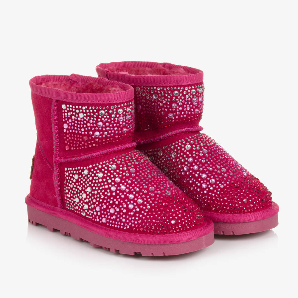 Encrusted with pink and silver diamanté, these bright pink suede leather boots for teen girls are by Monnalisa. Sure to keep feet warm and toasty, they are lined in the softest faux fur, with non-slip rubber soles for a good grip. For designer recognition, there are brown and gold diamanté logo patches on the heels.