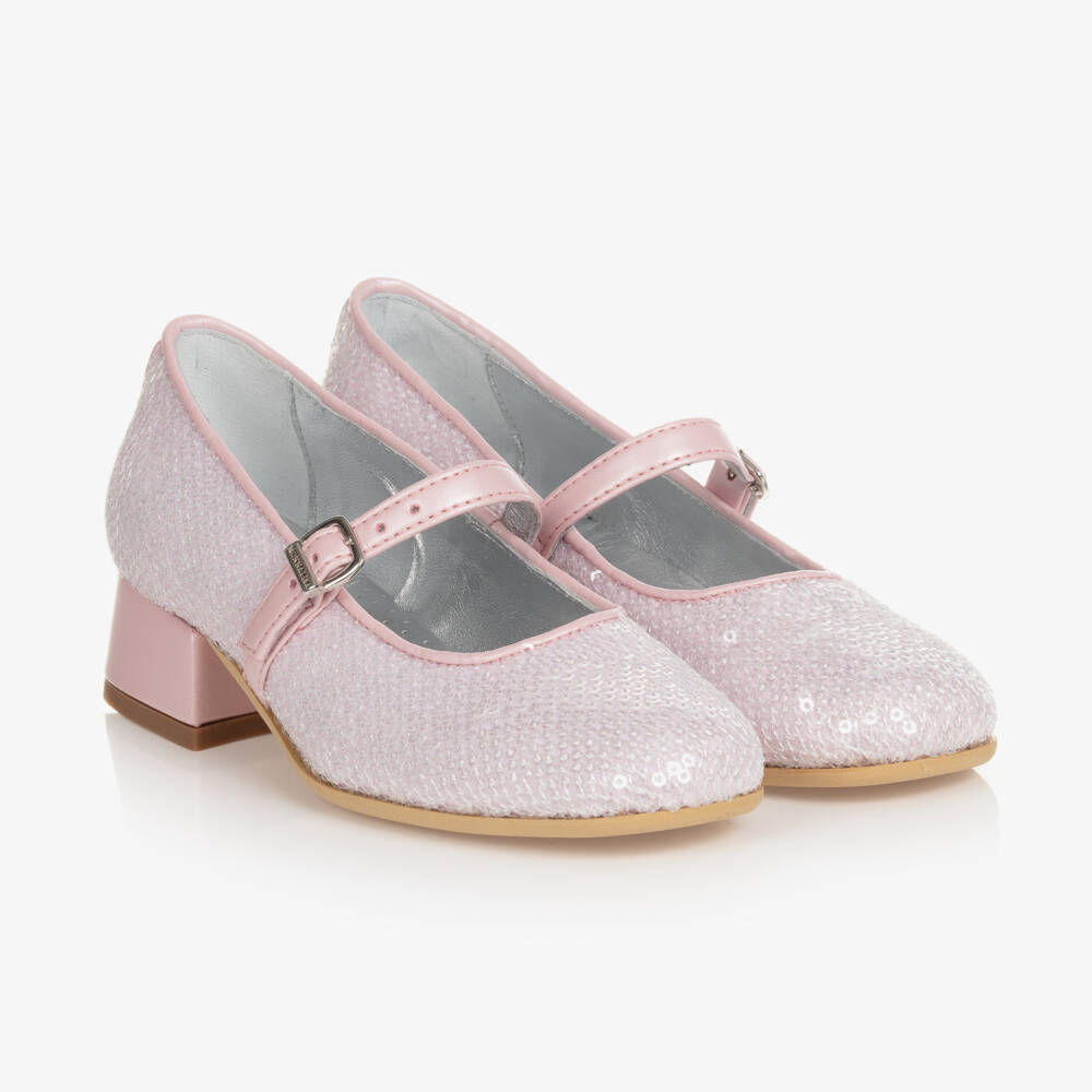 Designed by Italian brand Monnalisa, these stylish pink heeled ballerina shoes for teen girls are lovely for adding a touch of sparkle to any special occasion look. Featuring a chic heel, they have a simple pink strap across the front with a logo-embossed silver buckle fastening. They have a rubberised heel for good grip and a padded, metallic leather insole for comfort.