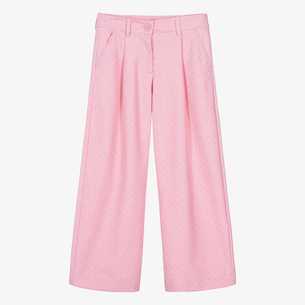 Gorgeous pink trousers for teen girls by Italian designer Monnalisa, covered in dazzling pink rhinestones for added impact. Ideal for a party or a smart occasion, these wide-leg trousers have pleated fronts and slanted hip pockets. They are softly woven in a lightweight, viscose blend and fasten neatly with an embossed button and concealed zip. The waistband, comfortably elasticated on the back, comes with useful loops to help keep a belt in place.