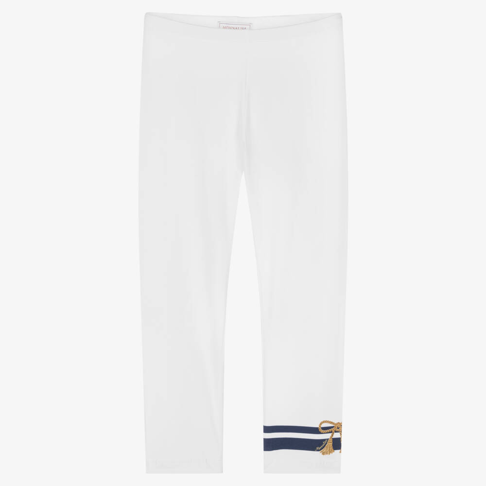 Teen girls white leggings by Monnalisa, trimmed with a nautical-inspired navy blue stripe around one ankle. A luxe gold rope motif is printed on one ankle, with a glamorous sparkly effect. They are made in soft cotton jersey for casual comfort and are in a versatile ankle length style.