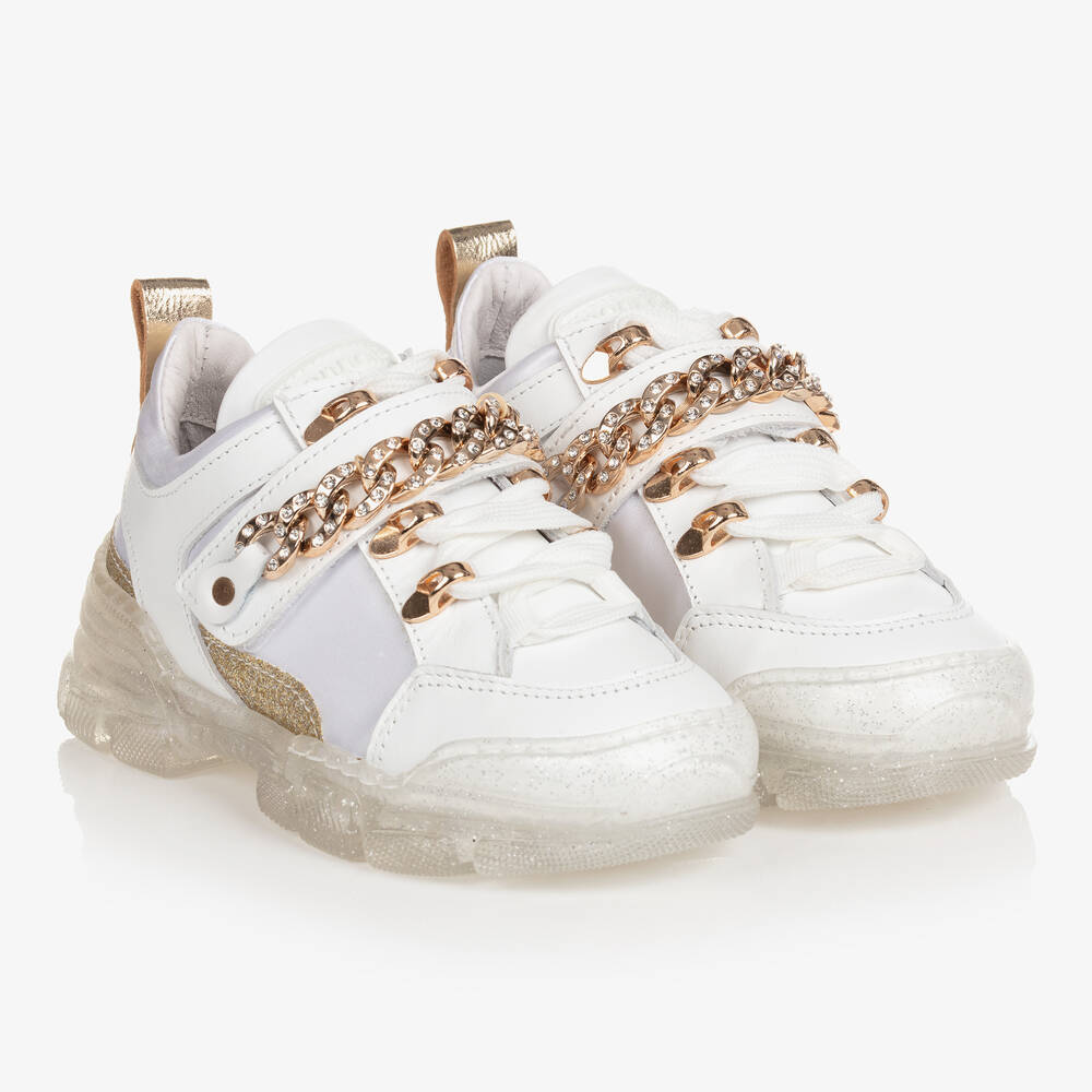 White leather trainers for teen girls with textile panels and rubberised logo patches from Monnalisa. These fashion-forward trainers have chunky clear rubber soles with silver glitter for a touch of sparkle and embellished chain detailing across the velcro strap. For extra glamour, gold pull tabs, lace loops and glitter paneling add contrast to the timelessly classic white trainers. To ensure comfort, they are lined with durable leather and have adjustable laces.