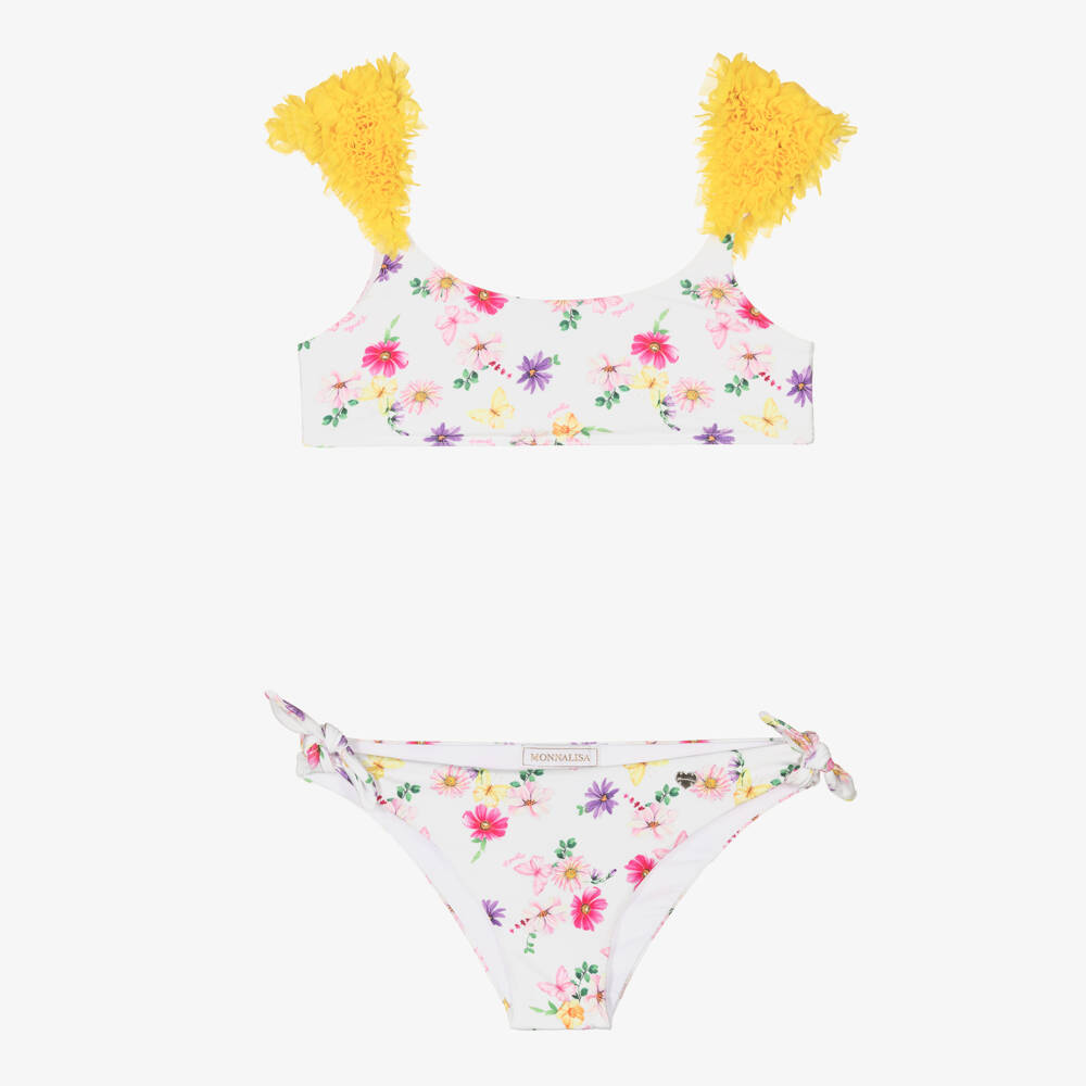 In a gorgeous floral pattern, this white bikini for teen girls is from Italian brand, Monnalisa. The brand's signature script logo is subtly signed throughout it's design. There are bright yellow ruffled tulle trims on the shoulder straps, with a silver heart-shaped logo on the bottoms. Silky smooth with a full lining, the sides have fixed tied for added style.