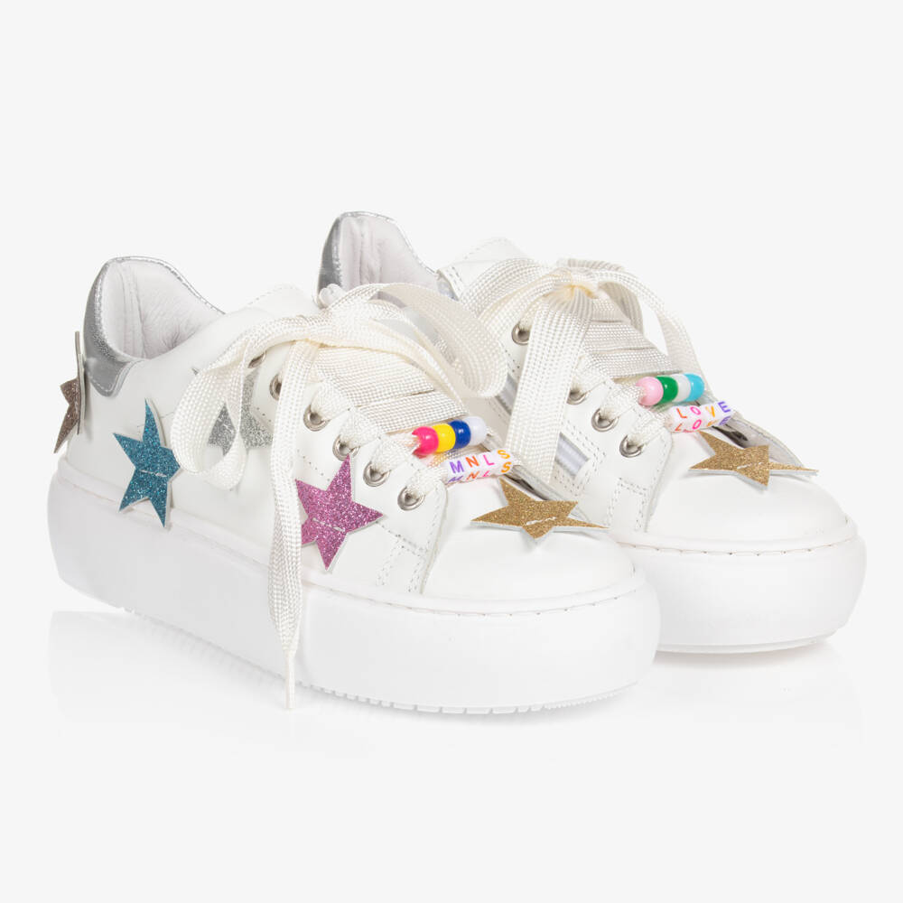 From Italian brand, Monnalisa are these teen girls white leather trainers with glitter star appliqués on the uppers. Full of personality, these playful shoes have thick shiny laces decorated with colourful beads and cubes spelling out the designer's name. Made in premium quality leather, they also fasten with a side zip and velcro strap. The silver logo-embossed heel is padded for comfort and they are leather lined, with a leather inner sole. The outer soles are made from rubber and are non-slip for a sure grip.