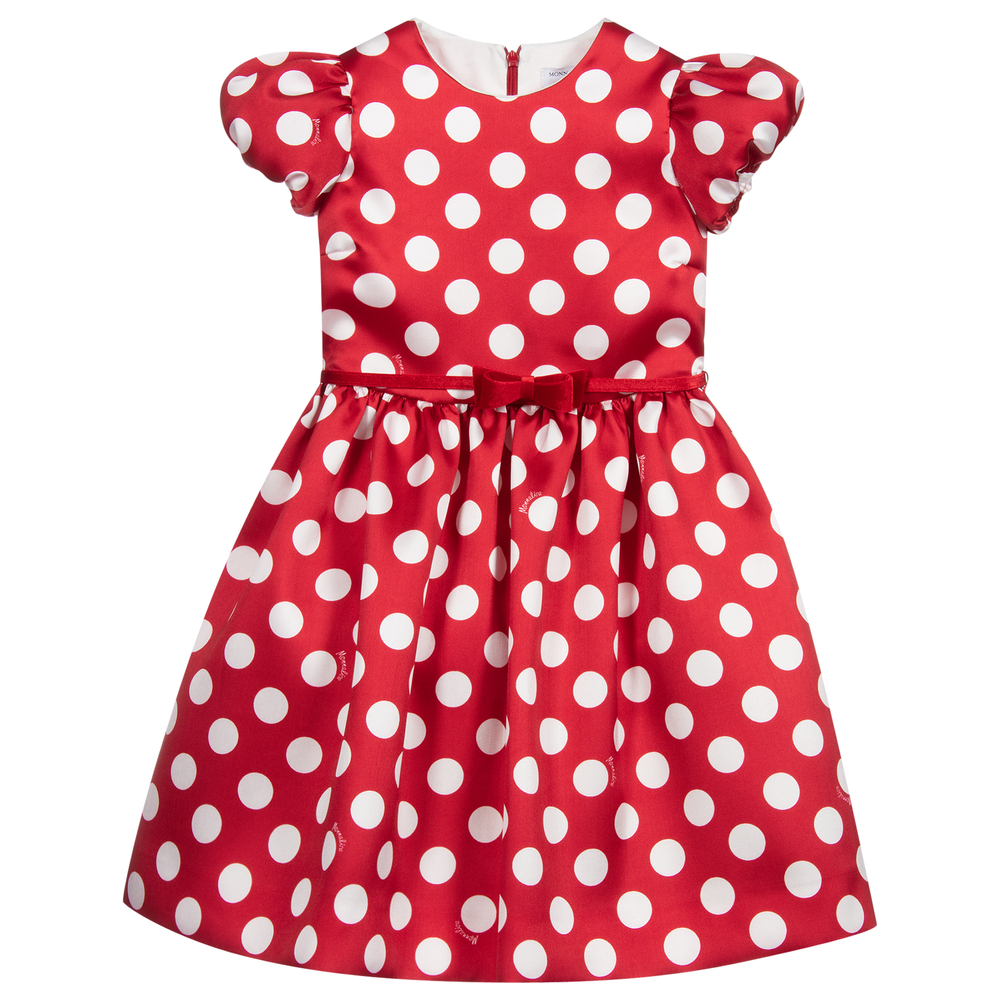 Red dress for teen girls by Italian designer Monnalisa, with white polka dots. Made in soft satin and fully lined, it has pretty puffed sleeves and a removable velvet belt. There is a tulle trim on the lining for extra volume.