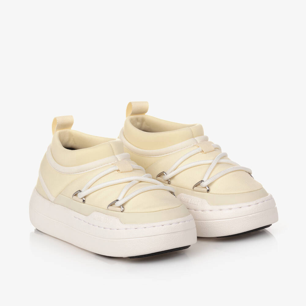 Stylish ivory trainers for boys and girls by Italian brand Moon Boot, in a cool, futuristic design. With distinctive Moon Boot styling, these gently padded, water-repellent shoes have cushioned insoles and a pull-tab on the heel allowing them to slip on easily. There are decorative laces on the front, with a bold, white logo print on the back and further branding on the midsole. For improved grip on slippery surfaces, the chunky, non-slip rubber outer sole features tiny suction cups. The technological foam lining will feel snug at first but will mould to the size and shape of the foot after a few hours of wear.