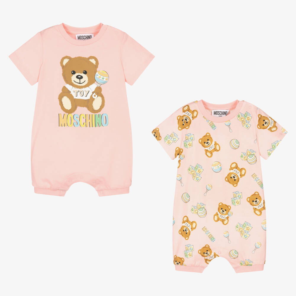 A pack of two pink shorties for baby girls by Italian brand Moschino Baby, made in delicately soft cotton jersey. Both shorties feature the brand's instantly recognisable Teddy Bear logo for an adorable, statement style. There are popper fastenings on one shoulder and between the legs.