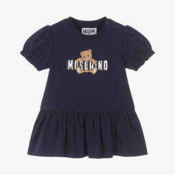 Cute dress in vibrant yellow for baby girls by Moschino, with the brand's playful Moschino Teddy Bear logo. It is made in soft cotton jersey for comfort, with pretty puffed sleeves and poppers on one shoulder for easy dressing. A dropped waist and a pretty ruffle skirt complete the look.