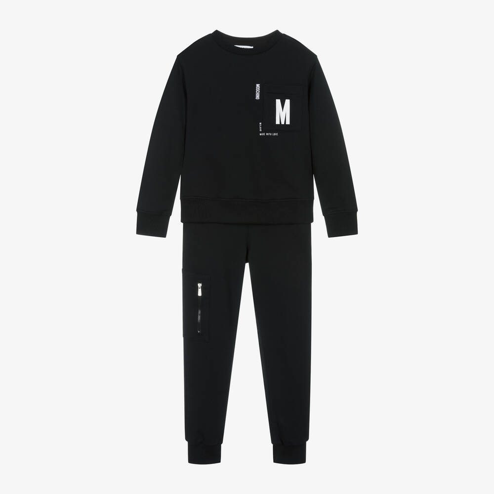 A cool black tracksuit for boys and girls by Moschino Kid-Teen, inspired by the adult collection. Made in comfortable cotton jersey, the sweatshirt has a white 'M' logo printed on the chest pocket with a slogan that reads 'Milano Made With Love'. The paired joggers feature the same branding on the back and a handy zip pocket on one leg. They have a ribbed waistband and slanted front pockets for everyday essentials.