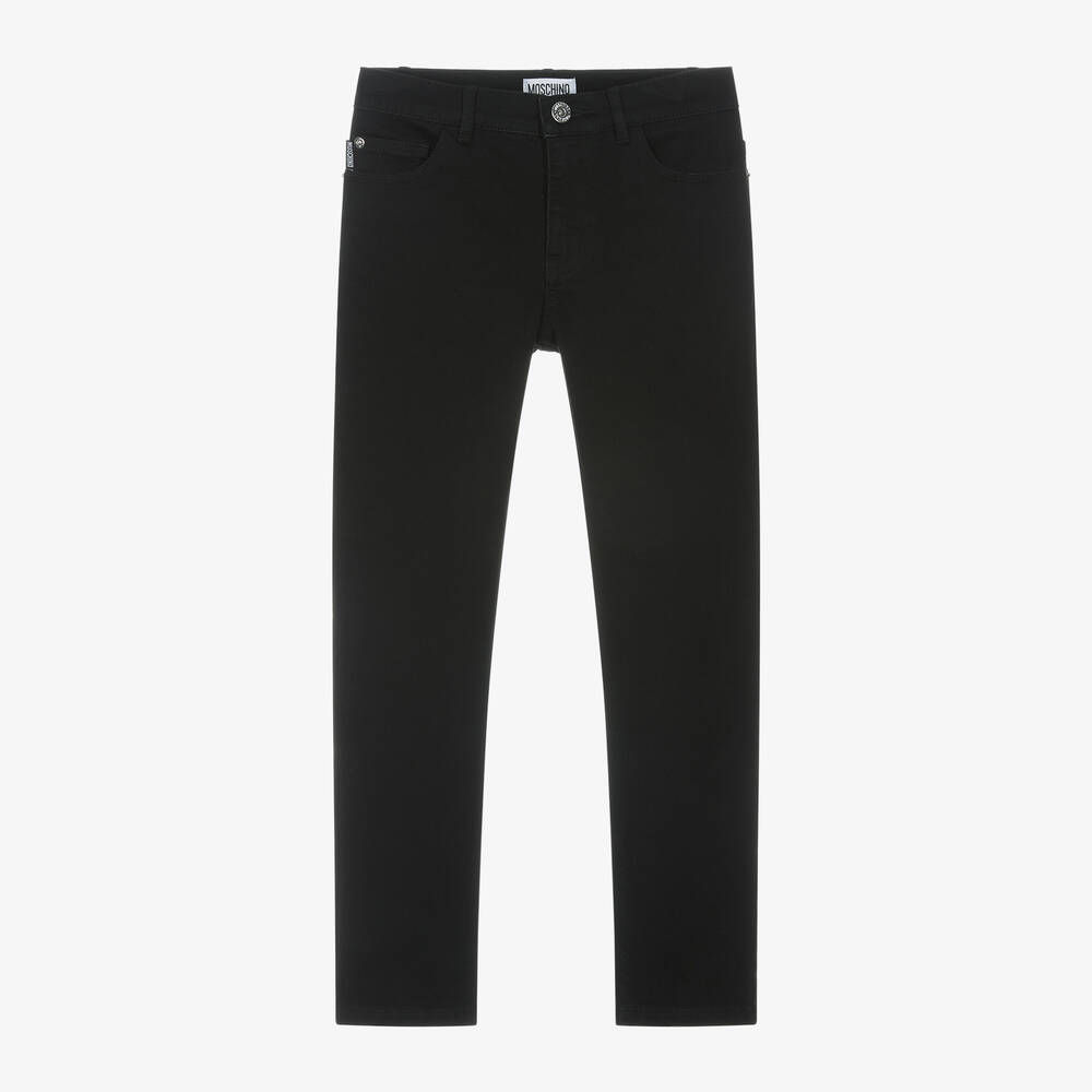 Black slim fit denim jeans for boys by luxury Italian label Moschino Kid-Teen, with the designer's rubberised Teddy Bear logo patch on the back for instant designer appeal. Made in a comfortable cotton and viscose blend with stretch, they have a useful, adjustable waist for a good fit, and fasten with a branded button and zip.