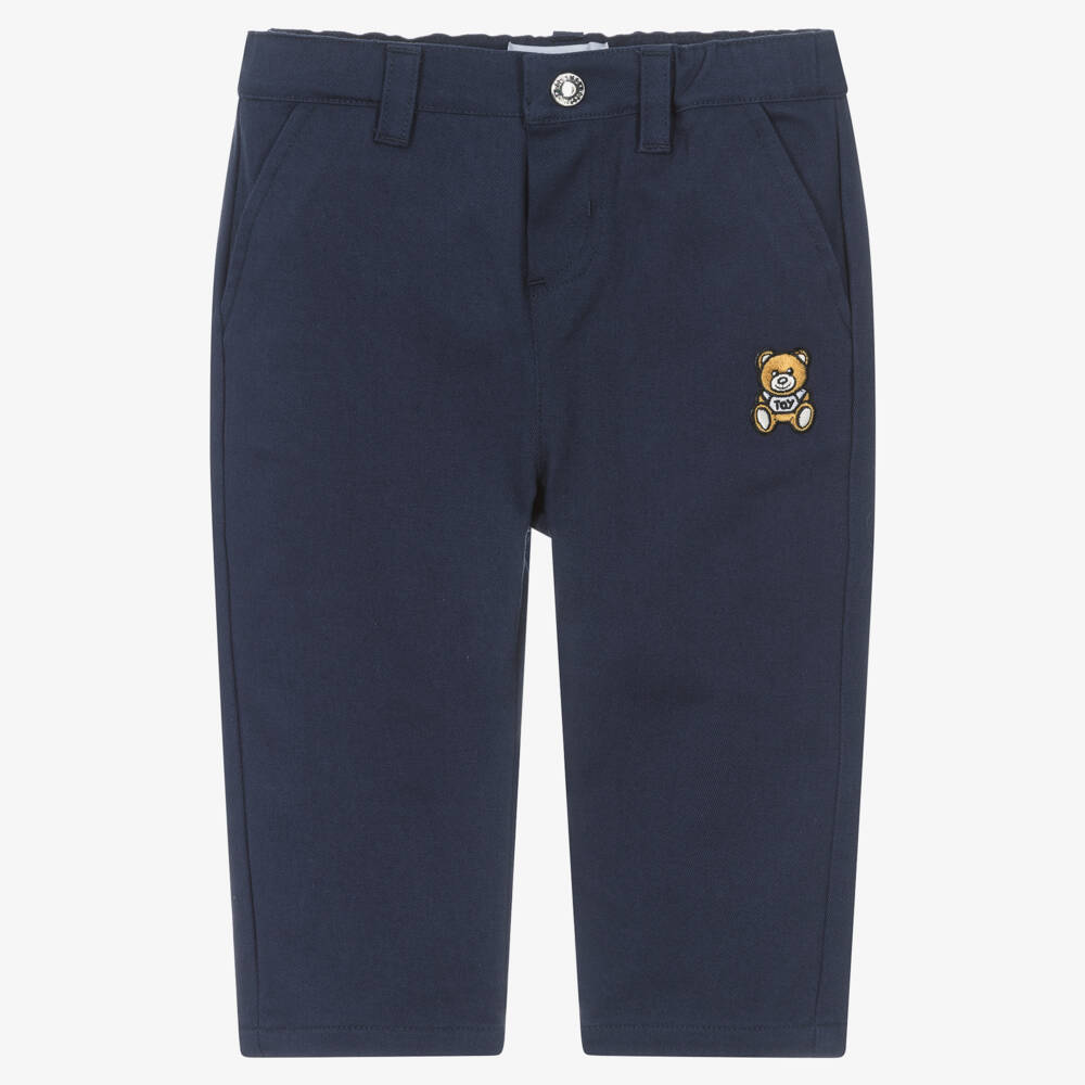 Ivory trousers for little boys by Moschino Baby, made in soft cotton twill with a slight stretch. They have a cute Moschino Teddy Bear appliqué badge on one leg. There are slanted front pockets and faux back pockets. These cute trousers have an elasticated waist and fasten with a branded popper on the front for a discreet designer finish.