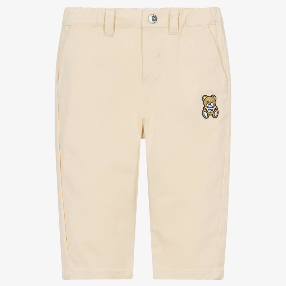 Ivory trousers for little boys by Moschino Baby, made in soft cotton twill with a slight stretch. They have a cute Moschino Teddy Bear appliqué badge on one leg. There are slanted front pockets and faux back pockets. These cute trousers have an elasticated waist and fasten with a branded popper on the front for a discreet designer finish.