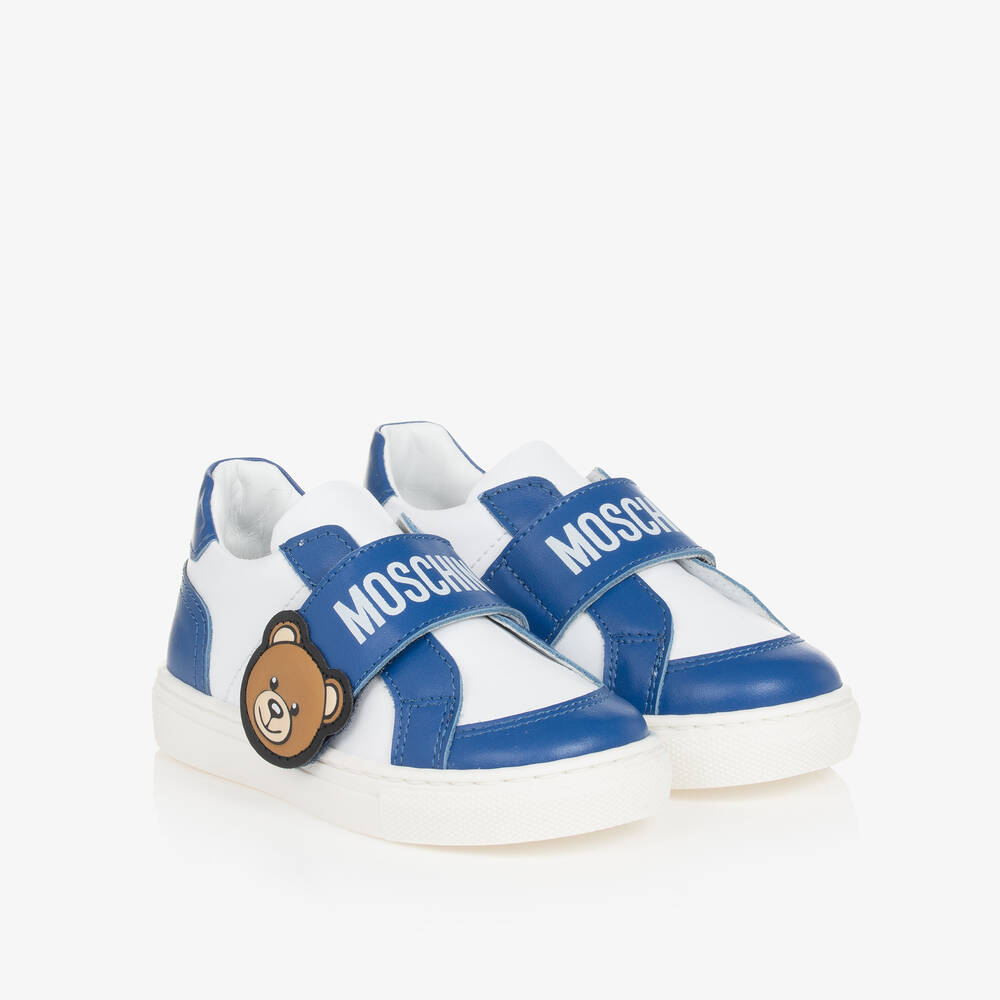 Leather trainers for boys from luxury Italian label Moschino Kid-Teen, in bold white and cobalt blue. Great for adding designer impact to their outfit, the brand's signature logo is printed across the velcro strap with the iconic Moschino Teddy Bear on the end. These sneakers are lined in the smoothest leather with a non-slip rubber outsole for grip.