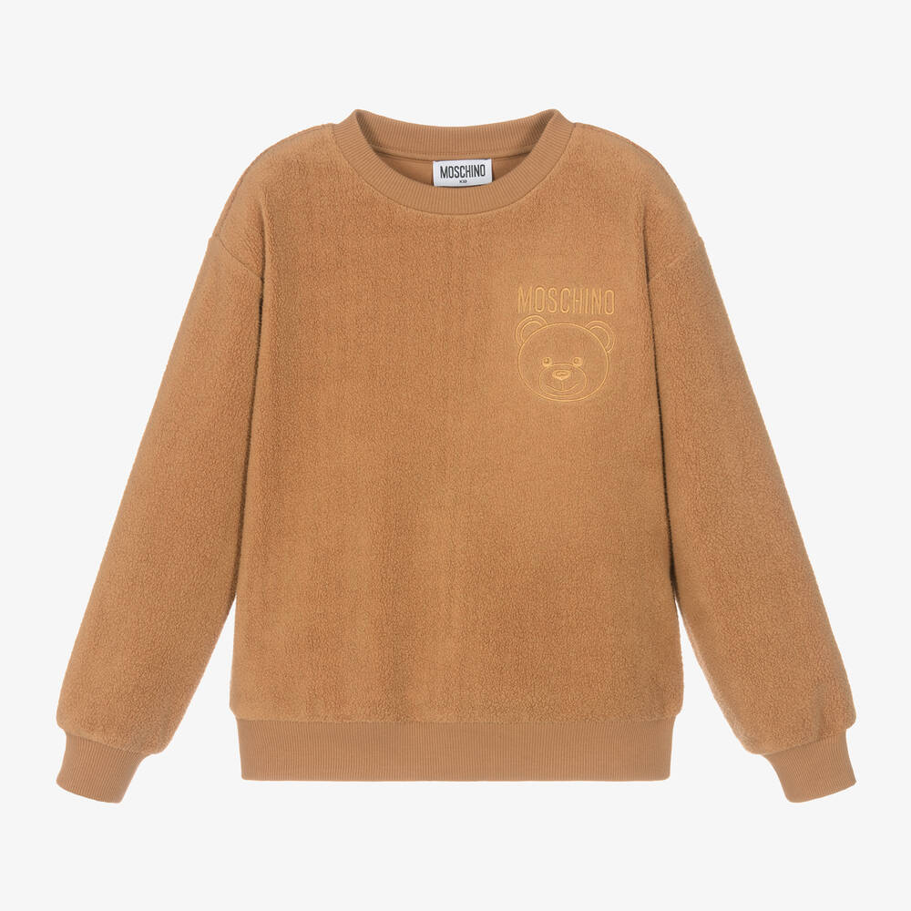 Cosy tan brown fleece sweatshirt for boys and girls by luxury Italian designer Moschino Kid-Teen. For instant brand recognition, the signature Moschino Teddy Bear and logo are embroidered on one side. In a relaxed, drop-shouldered style, it is made in a comfortable cotton and modal blend jersey, with neat, ribbed trims.