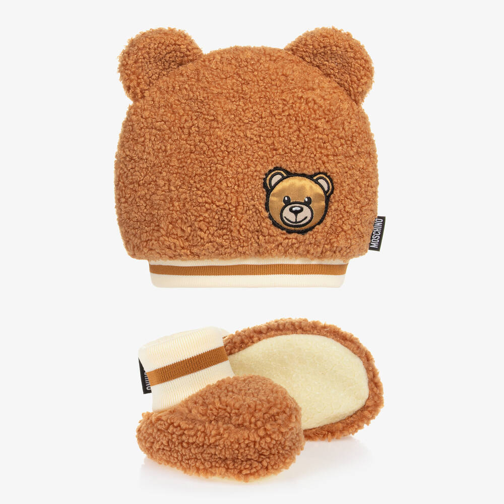 Adorable brown hat and booties set for baby boys and girls by Moschino Baby, made in soft, teddy fleece and lined with soft cotton jersey. The hat has a striped ribbed trim, with sweet 3D ears on the top. A shiny Moschino Teddy Bear appliqué on the front, adds a cute designer touch. It comes with a pair of matching booties, with rubber grips on the soles to prevent slipping.