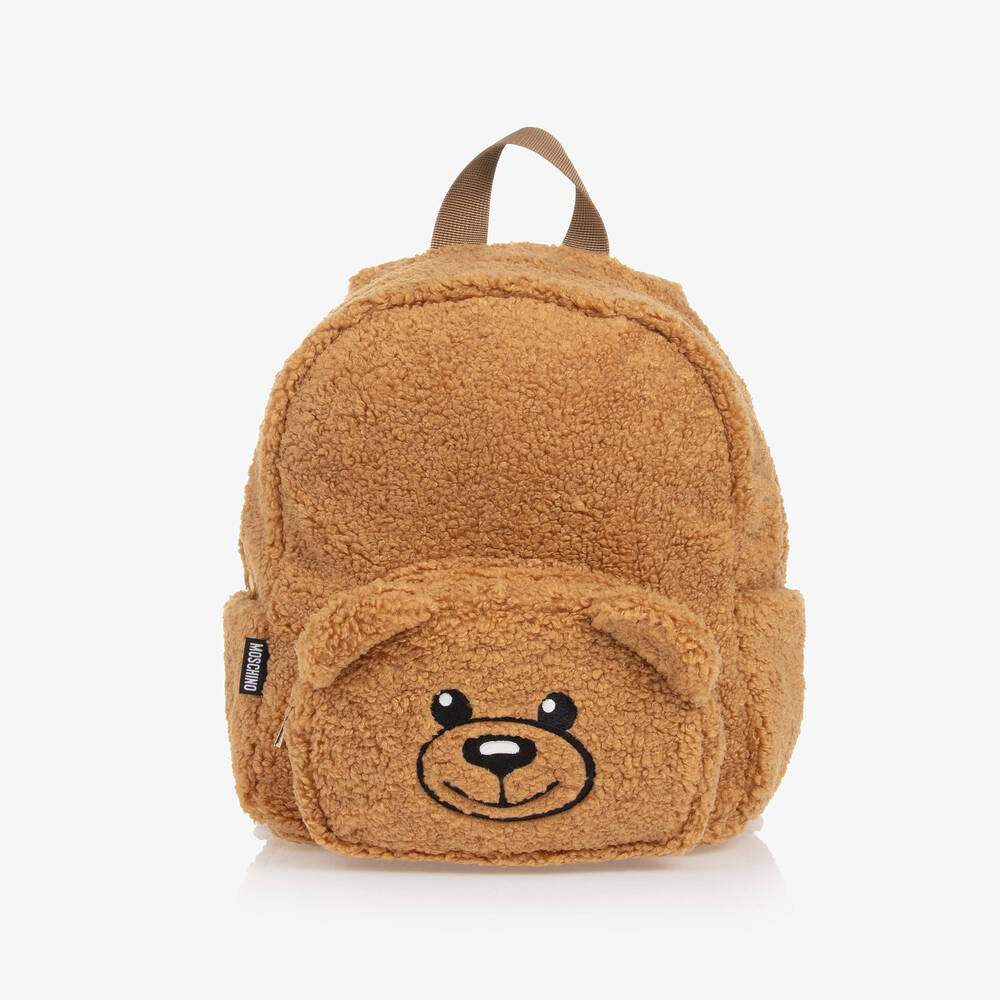Tan brown backpack for boys and girls by Moschino Baby, made in soft teddy fleece with a lightweight jersey lining. The main compartment fastens with a zip and there are side pockets, ideal for a small drinks bottle. There is an additional zip fastening pocket on the front, featuring cute 3D ears and a black embroidered Moschino Teddy Bear. The back and adjustable shoulder straps are lightly padded for comfort and there is a useful carry handle.