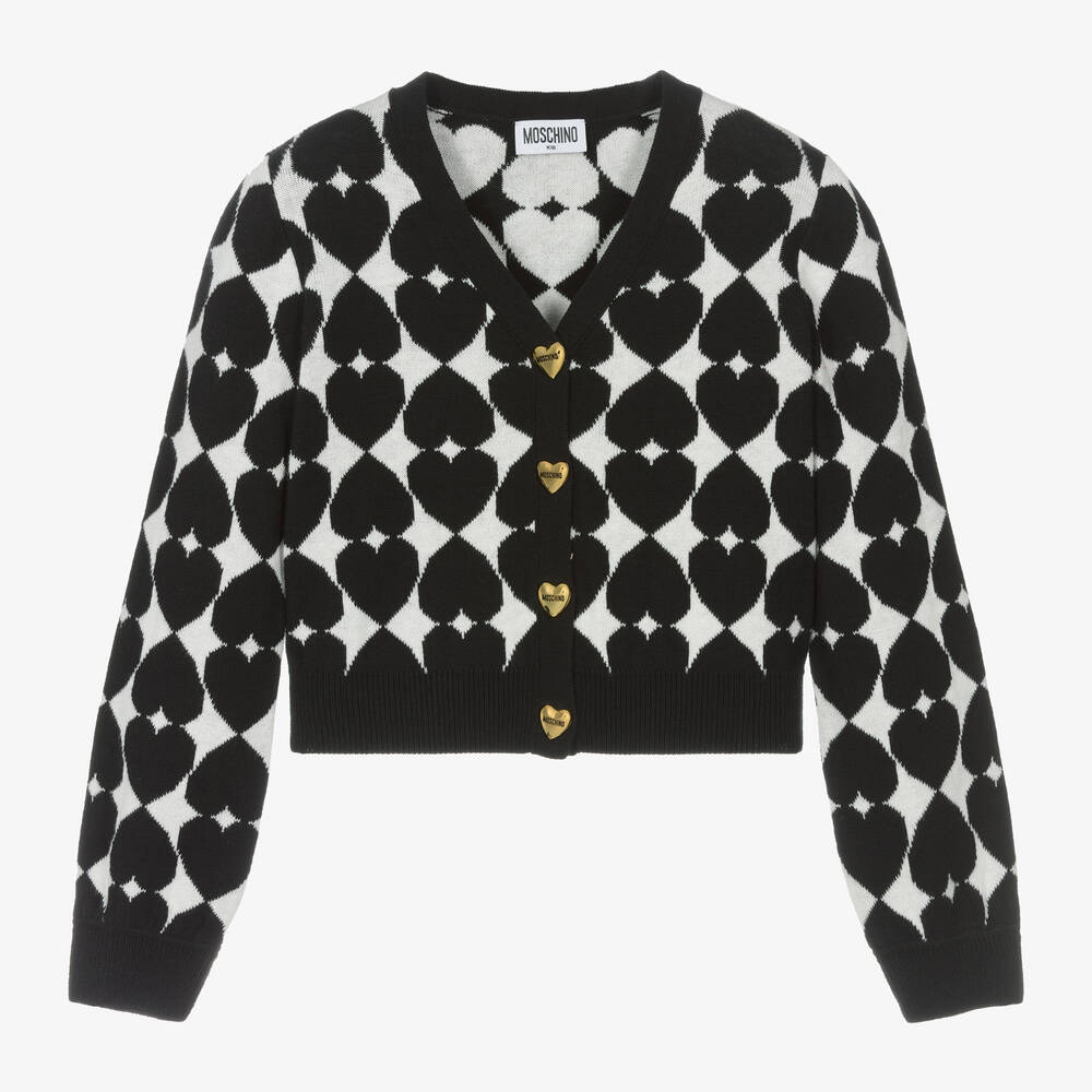 Black Mini-me cardigan for girls by Moschino Kid-Teen. Knitted in a beautifully soft cotton and wool blend, this lightweight layering piece has a jacquard heart pattern in a simple monochrome colourway. There are shiny gold heart popper fastenings on the front, each embossed with the luxury label's logo for a branded touch.