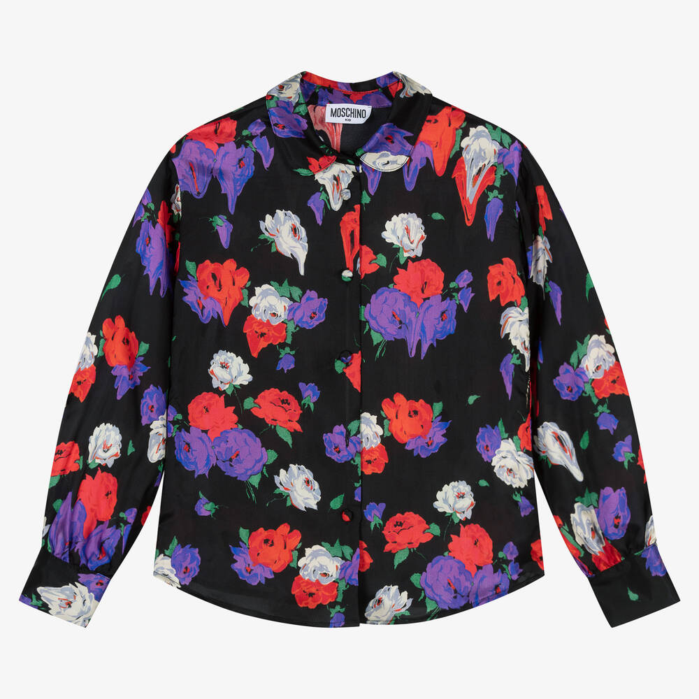 Beautiful black blouse for girls by luxury Italian designer Moschino Kid-Teen, made in silky viscose twill. As seen in the main collection, it is patterned with melted roses in red, purple and green, a signature look for the label. For a stylish finish, it has a rounded collar and fastens with covered buttons.