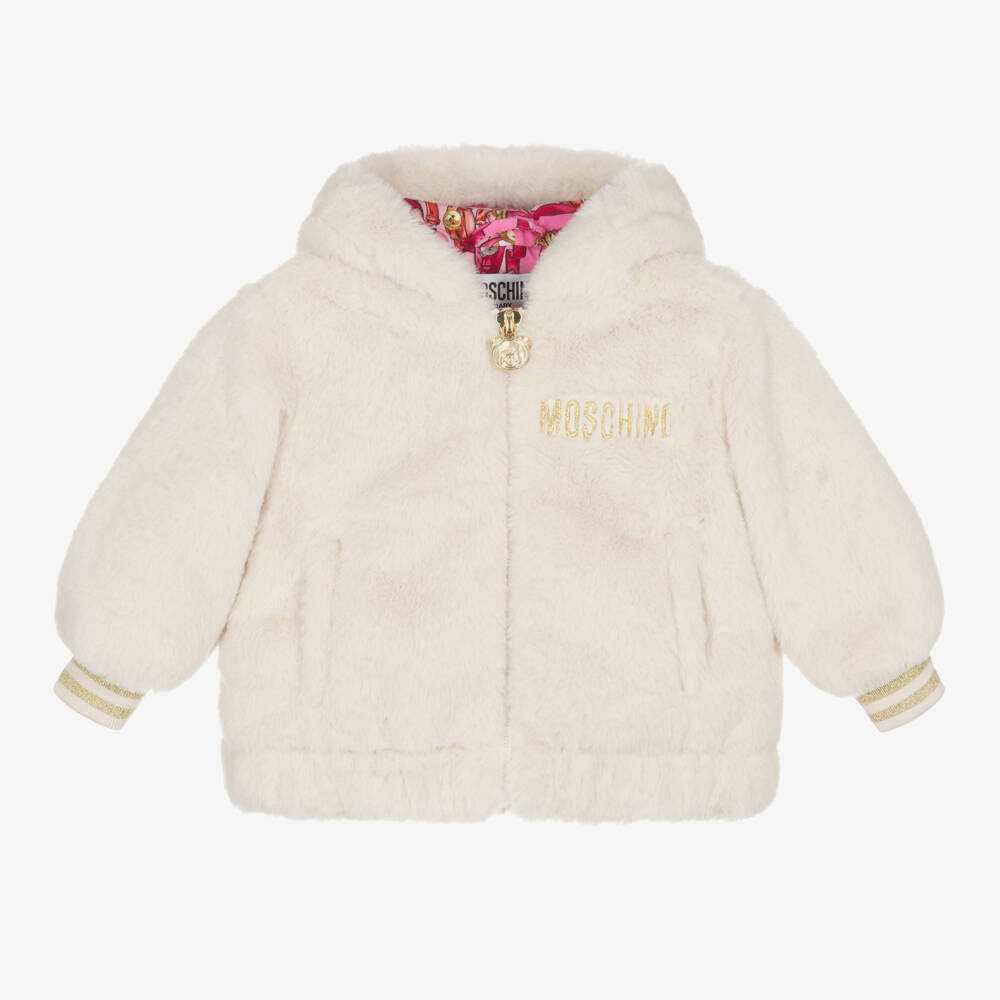 Lovely ivory hooded jacket for little girls by Moschino Baby, made in super soft faux fur. It has glittery gold trims on the ribbed cuffs and a gold embroidered logo on the chest. There are little pockets on the front and a gold zip with a Moschino Teddy Bear logo pull. The comfortable bright pink lining is made in soft cotton jersey and is patterned with Moschino Teddy Bears and logo belts for a fun contrast.