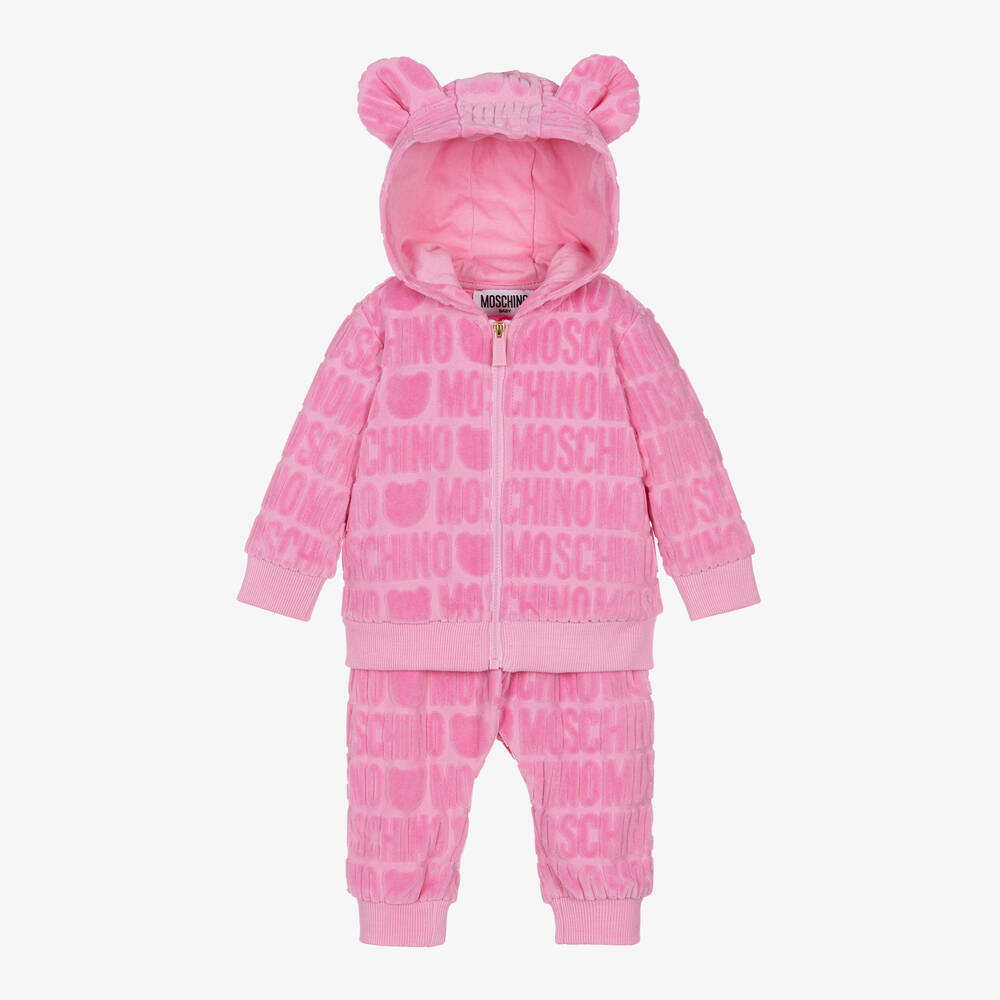A fun pink tracksuit for little girls by Moschino Baby, made in soft velour with raised logo lettering and Teddy Bear motifs. Unmistakably Moschino, the long-sleeved top has a branded zip pull and stretchy ribbed trims for comfortable wear. Pockets are concealed on the side seam. The jersey-lined hood, providing extra warmth, has pop-up ears on the top for a cute touch. Matching joggers, styled with a stretchy waistband, complete this head-to-toe designer look.