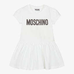 Simply casual, this white dress for little girls is by Moschino. Made from soft cotton jersey, it is printed with a bold black logo for an instantly recognisable look. This short-sleeved style fastens with practical poppers on one shoulder.