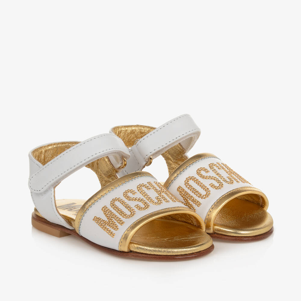 Стильные белые кожаные сандалии для девочек от роскошного итальянского бренда Moschino Kid-Teen. Спереди красуется золотистый логотип из стразов, а золотистая отделка металлик придает им блеск и гламурный вид. Сандалии оснащены удобными ремешками на липучках, стелькой с легкой набивкой и резиновой подошвой.